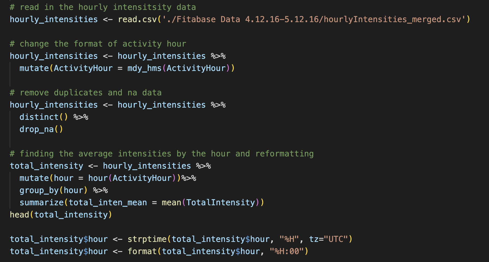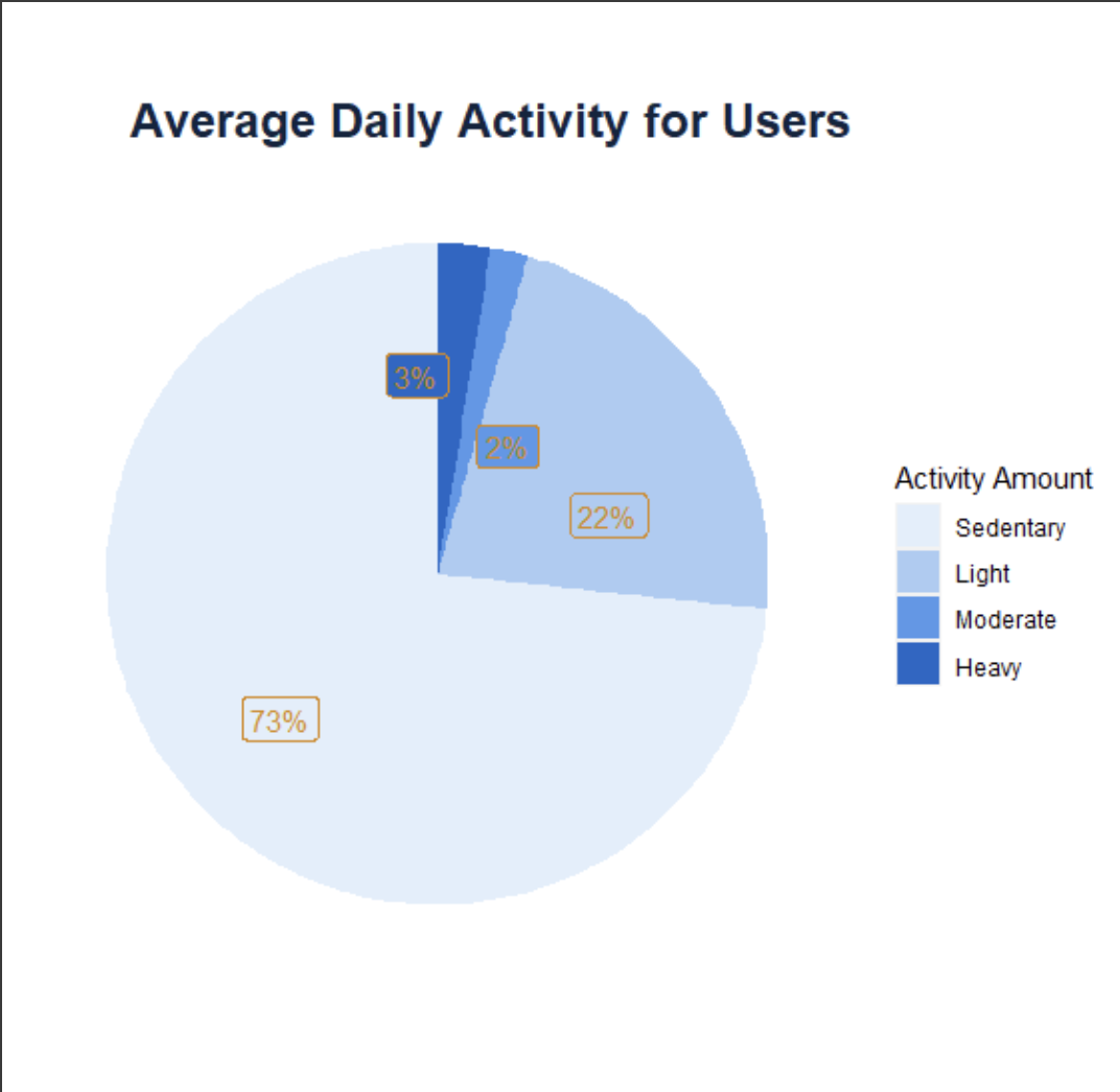 Above, I created a new data frame to hold the necessary data. One column has the types of activity. The second column houses the average amount of time a user exerts the class of activity. The third column will hold the percentage of each type of activity. To find the percentage, I need to find the total average of active minutes. Once completed, I can create my graph.