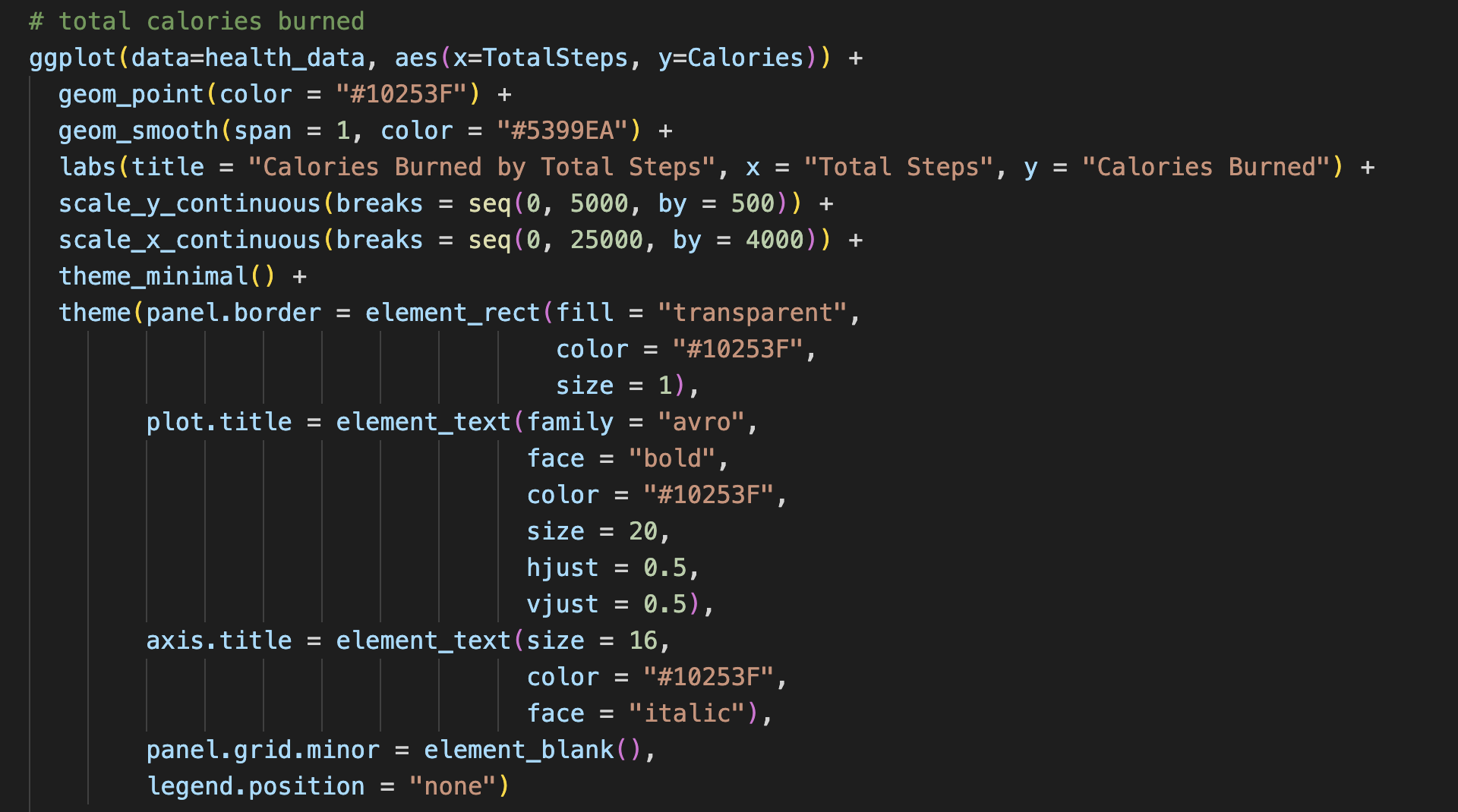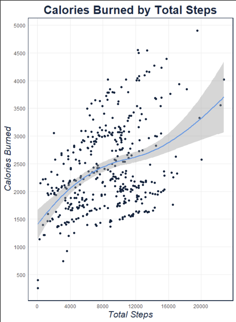 Looking at the summary of the health data frame, we can see that the Fitbit tracker is recording their activity. There are a few correlations with the data. One, we see calories burned increase and as total steps increase. Now, let's take a deeper dive into the two values.