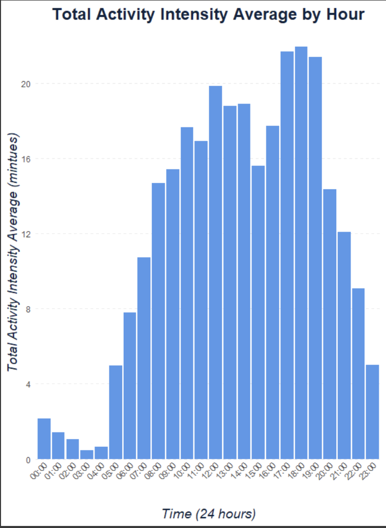Here we can see a drop in activity between 20:00 - 7:00 on a daily average. However, this is probably because people are possibly taking a nap. There is a drop in the middle of the day, 15:00 - 16:00.
