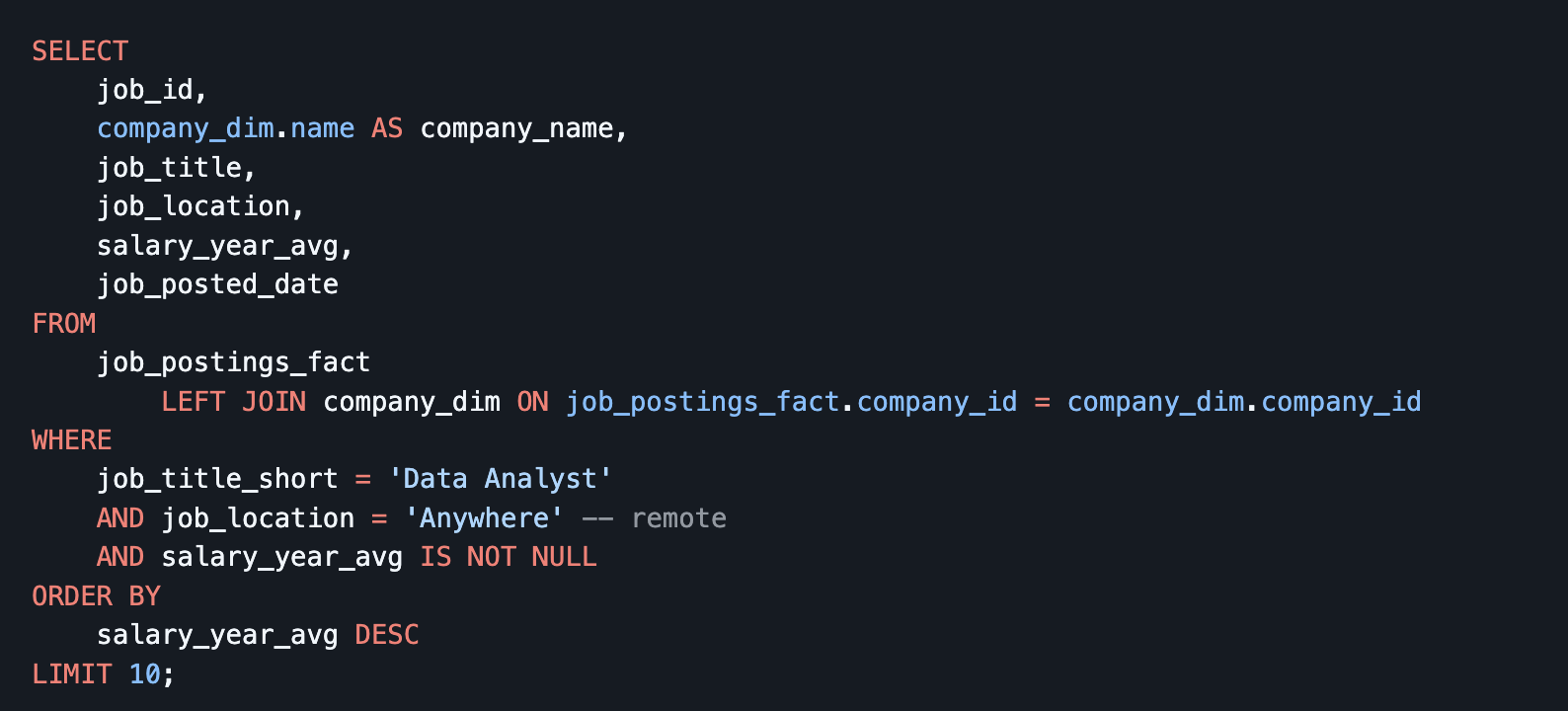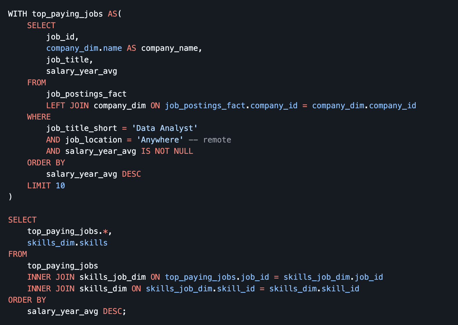 To find the required skills for the highest-paying job, I need to join more datasets. I already know the highest-paying jobs and will keep it as a subquery for my new query. I need to filter the different skills associated with these highest paying jobs.