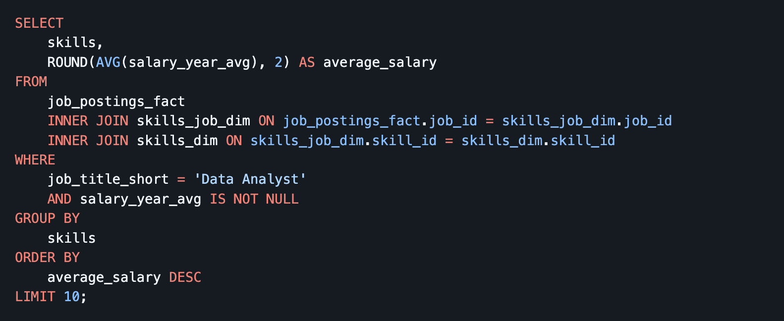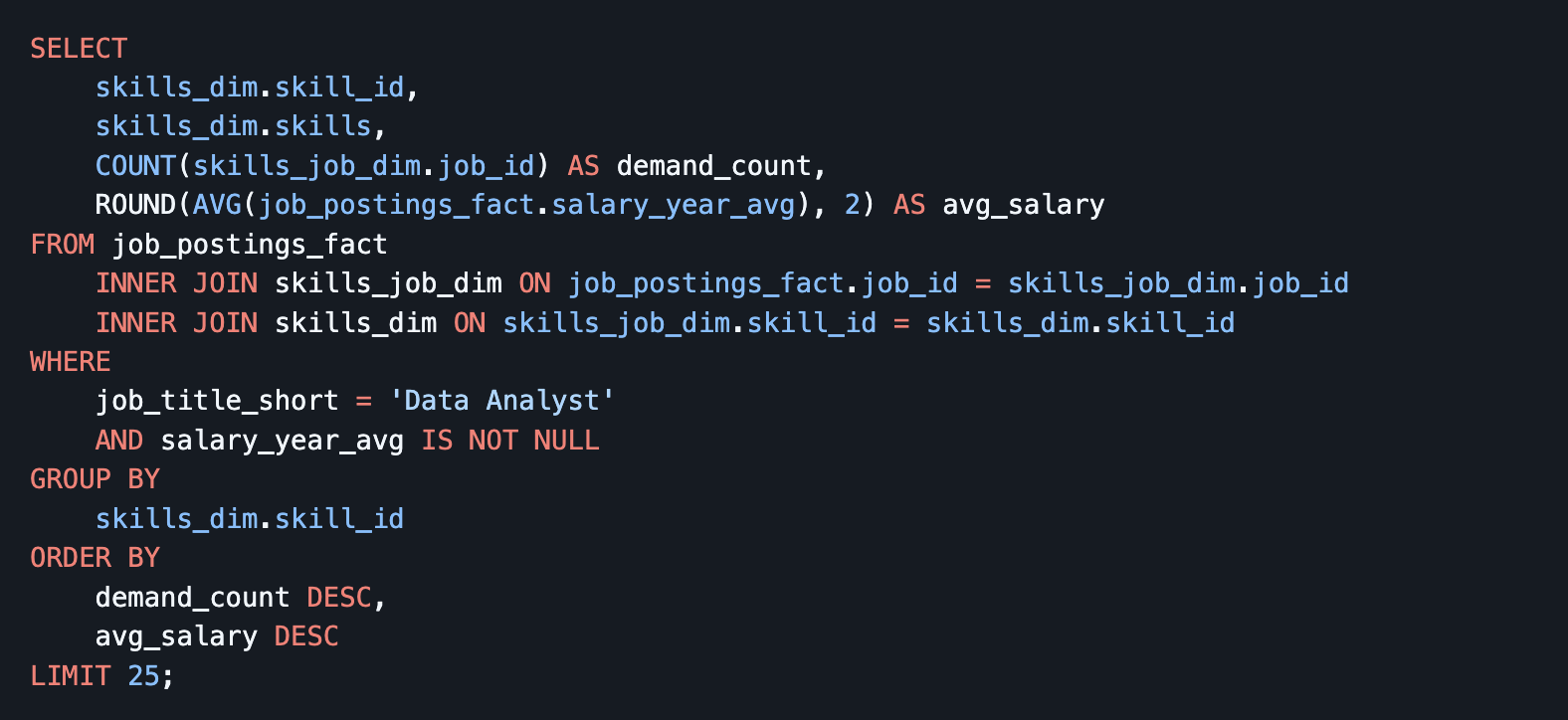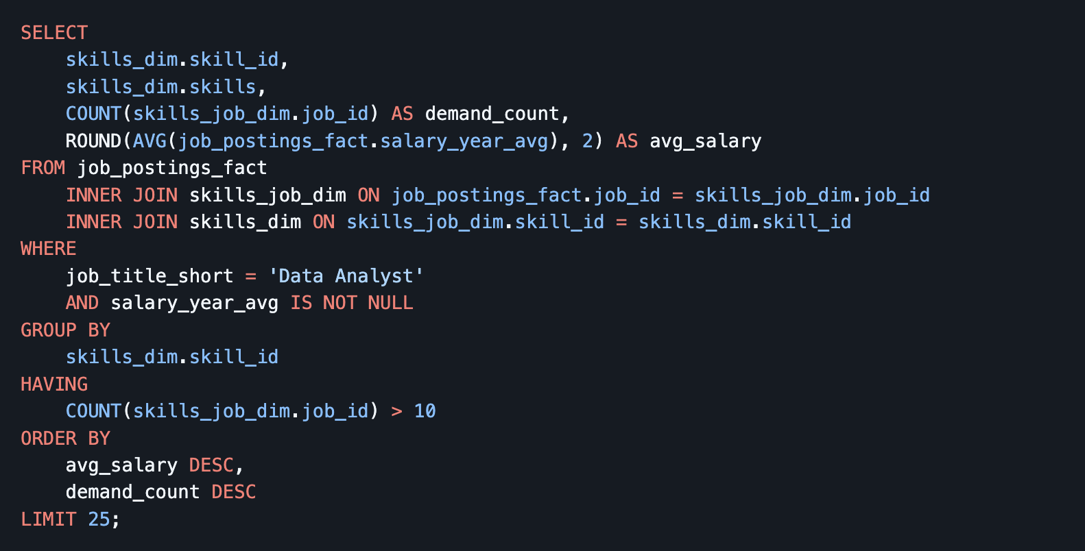 Now I want to combine the previous two queries to pinpoint skills that have high demand and a high salary. This will offer strategic skill development.